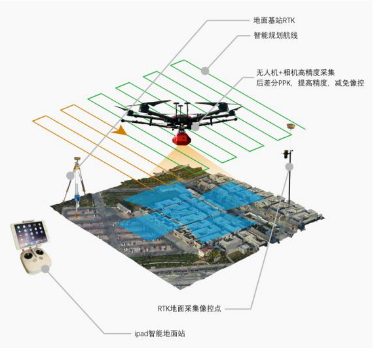 無人機傾斜攝影是近年來新興技術發展的典型代表,傾斜攝影可以全面的展現地表地貌的地理信息,通過無人機搭載GPS、高清相機,按照約定的軌跡對地物目標區域進行快速、全方位的的影像數據采集,利用智能化的數據處理軟件快速進行影像拼接、空三加密、最終構建目標區域的數 字正射影像圖和三維立體模型等。無人機傾斜攝影在地質災害調查、國土空間規劃、公安消防等領域有著很好的應用效果。